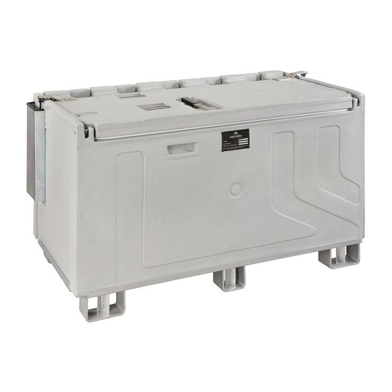 Thermobehälter Toplader mit 500 Litern Kapazität und Palettenfüssen für Supermarktketten, Logistikunternehmen, Vertreiber und Hersteller von Frisch- oder Tiefkühlware, Transportunternehmen.